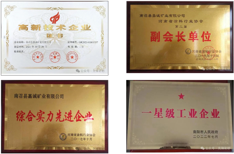 嘉誠礦業還與河南大學簽訂技術合作協議,開展研發創新工作,通過對礦產資源進行深加工,開發高價值的建筑用材料及涂料,以促進嘉誠礦業的轉型升級,實現產品的提質增效。在全體人員的努力下,嘉誠礦業先后獲得了“國家高新技術企業”、“河南省企業技術中心”、“河南省專精特新企業”等光榮稱號,并多次被評選和命名為“綜合實力先進企業”、“誠信經營先進企業”、“河南省涂料行業優秀供應商”等,2022年被南陽市人民政府授予星級企業。