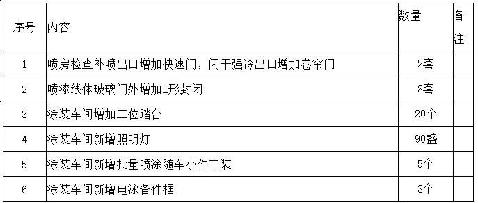 2.1項目概況:因車身噴涂生產工藝的優化,需要對涂裝車間內的噴漆室、工位室體、點修補等工位進行設備改造。