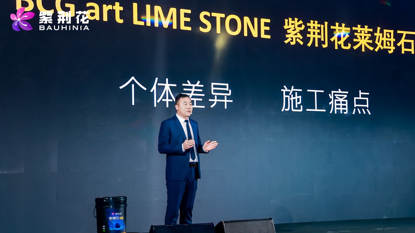 千呼萬喚始出來,隨著屏幕切換,紫荊花萊姆石產品終于露出神秘的面紗,張總分別從消費背景、人居環境、品質追求等角度剖析紫荊花萊姆石產品的獨具匠心,作為大自然賦予人類的“生命之石”,紫荊花萊姆石涂料自然素雅,高貴大氣,符合現在消費者對產品個性化的追求,涂料創新性地融入暖地大地色,采用微米級3D肌理技術,在萊姆石的肌調上締造藝術美學,完美呈現質感舒適的家居生活。張總表示,隨著“靜奢風”的盛行,紫荊花萊姆石將用“自然”的聲音表達渴望,體現更高級非凡“靜奢”之美,這也是未來BCG藝術涂料產品不斷升級的方向。