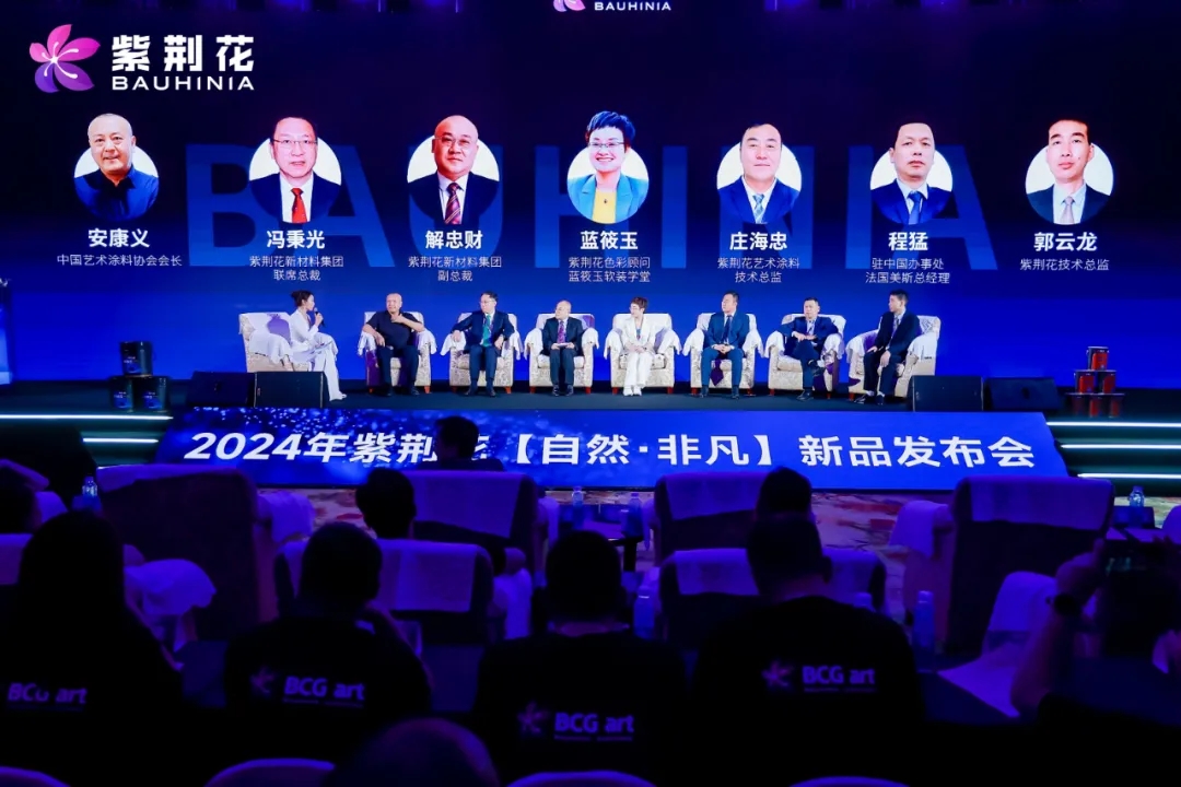 為探討藝術涂料未來發展趨勢以及紫荊花新材料集團未來發展規劃,本次發布會特設了一場融合論壇:由多家行業知名媒體參與提問,紫荊花新材料集團聯席總裁馮秉光先生、紫荊花新材料集團副總裁解忠財先生、中國涂料工業協會藝術涂料分會理事長安康義先生、駐中國辦事處法國美斯總經理程猛先生、紫荊花色彩顧問、藍筱玉軟裝學堂創辦人藍筱玉女士、紫荊花新材料集團建筑涂料事業部藝術涂料技術總監莊海忠、紫荊花新材料集團建筑涂料事業部技術研發中心副總監郭云龍,圍繞“紫荊花新材料集團長遠發展戰略”、“紫荊花下一步市場推廣規劃”、“兩款新品的產品優勢及戰略層面解讀”、“藝術涂料產品創新和行業競爭”等話題展開對話和交流。