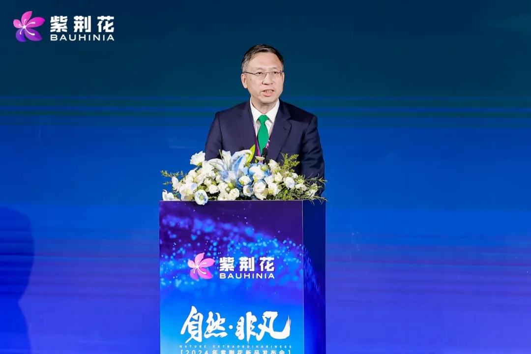 緊接著,馮秉光先生、陳傳生先生、解忠財先生、安康義先生、鄒園女士、程猛先生、藍筱玉女士受邀一同上臺進行啟動儀式,在5、4、3、2、1的倒數聲中,大屏幕上飛舞著大會的主題詞,正式宣布2024年紫荊花【自然·非凡】新品發布會正式啟動!