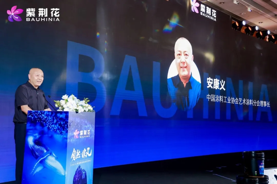 中國涂料工業協會藝術涂料分會理事長安康義先生上臺致辭,安康義先生先是提到了中國涂料工業協會藝術涂裝分會成立的意義,在促進行業規范發展的同時,也將積極推動中國藝術涂料行業進入國際市場。安康義先生還高度贊揚了紫荊花作為高端藝術涂料頭部品牌對涂料行業發展作出的杰出貢獻,展現了一個民族品牌的責任與擔當,在愈發內卷和激烈的市場上,紫荊花仍然堅守初心,銳意創新,推出的產品性能有效解決了行業長期以來的痛點,如易施工性、高端大氣效果等,期待未來更多像紫荊花這樣高創新、高標準的企業涌現,共同推動中國藝術涂料行業的繁榮和發展。