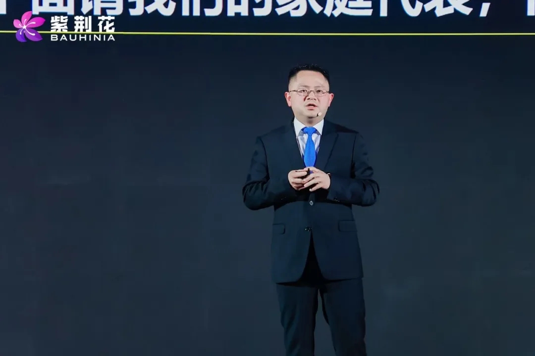 紫荊花新材料集團聯席總裁馮秉光先生上臺致辭,馮總先是“劇透”了本次將要發布的兩款新品,一款是紫荊花BCGart萊姆石藝術涂料,另外一款則是紫荊花貝倍安原生硅基兒童墻面漆產品,兩款產品均有專利技術加持,各具特色,代表了各自品類差異化創新的新方向。同時,馮總還談到了剛剛過去的全國兩會,國家提出了“要牢牢把握高質量發展這個首要任務,因地制宜發展新質生產力”的會議精神,這與我們發布的兩款創新性產品的研發理念不謀而合,體現了紫荊花不斷向高端產品領域不斷進軍的決心,也體現了紫荊花“高性能表現成就健康生活”的品牌理念,代表了紫荊花未來的品牌轉型和規劃方向,期待這兩款創新性產品在市場能獲得更多消費者的認可,助力美好人居生活。