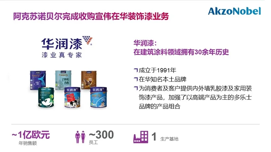 宣偉將旗下子公司N92 Menomonee Falls出售給了美國涂料制造商鉆石沃格爾(Diamond Vogel),還將包括華潤漆在內的中國建筑涂料業務進行了剝離,賣給了阿克蘇諾貝爾。