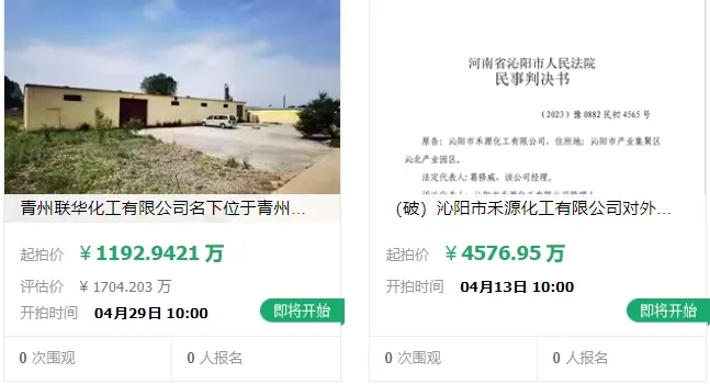 在某法拍網站上,部分涂料、化工企業由于破產倒閉,被進行資產、股權的拍賣,最高超過9億元,包括化工企業名下的土地使用權及其地上在建工程和機器設備,而低至千元以下的氣動泵、燈具等多個日用品類目也頻頻出現。