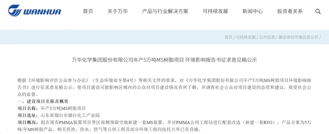 據(jù)悉,年產(chǎn)5萬噸MS樹脂項(xiàng)目的原料可依托萬華現(xiàn)有“MMA一體化項(xiàng)目”、“聚氨酯產(chǎn)業(yè)鏈一體化-乙烯項(xiàng)目”。