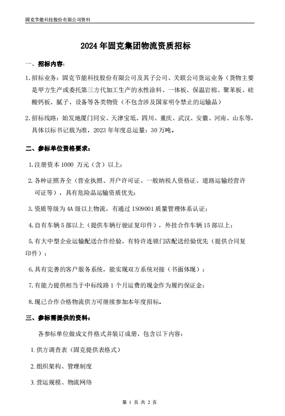 根據(jù)公司的發(fā)展戰(zhàn)略要求,為提高物流服務(wù)質(zhì)量,降低物流成本,現(xiàn)對2024年公司所有物流線路進行招標,本次先進行資質(zhì)審核,邀請相關(guān)優(yōu)秀物流企業(yè)積極參與,按要求提交相關(guān)信息,資質(zhì)審批通過后再發(fā)放標書進行報價。