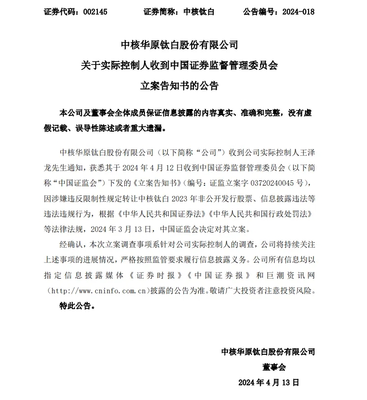 近日,國內鈦白粉龍頭企業中核鈦白發布公告稱,收到公司實際控制人王澤龍先生通知,獲悉其于2024年4月12日收到證監會下發的《立案告知書》,因涉嫌違反限制性規定轉讓中核鈦白 2023年非公開發行股票、信息披露違法等違法違規行為,根據《中華人民共和國證券法》《中華人民共和國行政處罰法》等法律法規,2024年3月13日,中國證監會決定對其立案。