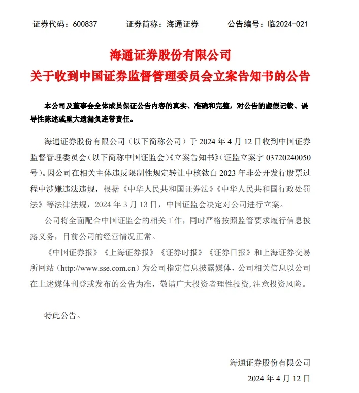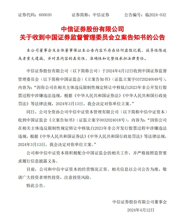 中信證券也公告,于2024年4月12日收到證監會《立案告知書》,內容為:“因你公司在相關主體違反限制性規定轉讓中核鈦白2023年非公開發行股票過程中涉嫌違法違規,根據《中華人民共和國證券法》《中華人民共和國行政處罰法》等法律法規,2024年3月13日,我會決定對你單位立案。”