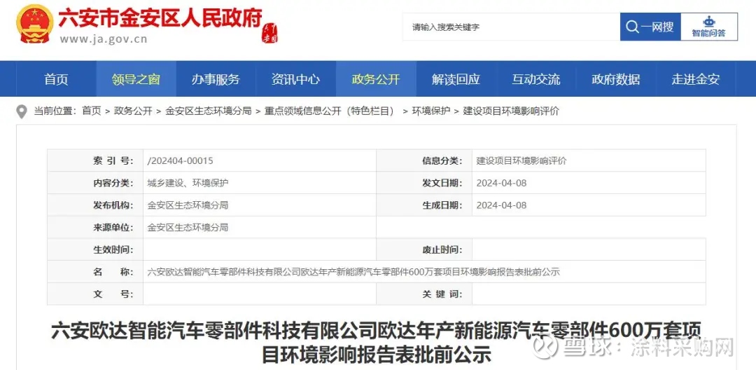 近日,六安市金安區人民政府發布《六安歐達智能汽車零部件科技有限公司歐達年產新能源汽車零部件600萬套項目環境影響報告表》。