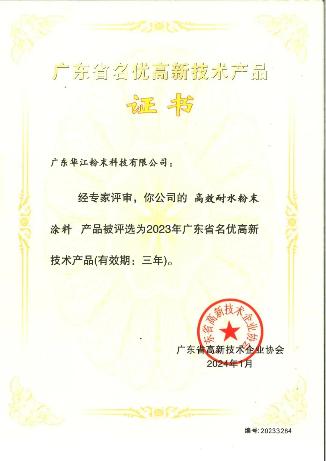 華江粉末2023年新申請發明專利3項。新獲得授權發明專利3項、實用新型專利2項。截止2023年底華江工廠累計擁有授權發明專利26項、授權實用新型專利4項,主導及參與制定粉末涂料涂裝相關標準項四十多項,發表科技論文99篇。2023年,廣東華江粉末科技有限公司的“低光澤抗彎曲粉末涂料”和“高效耐水粉末涂料”兩項創新產品,入選為廣東省名優高新技術產品。