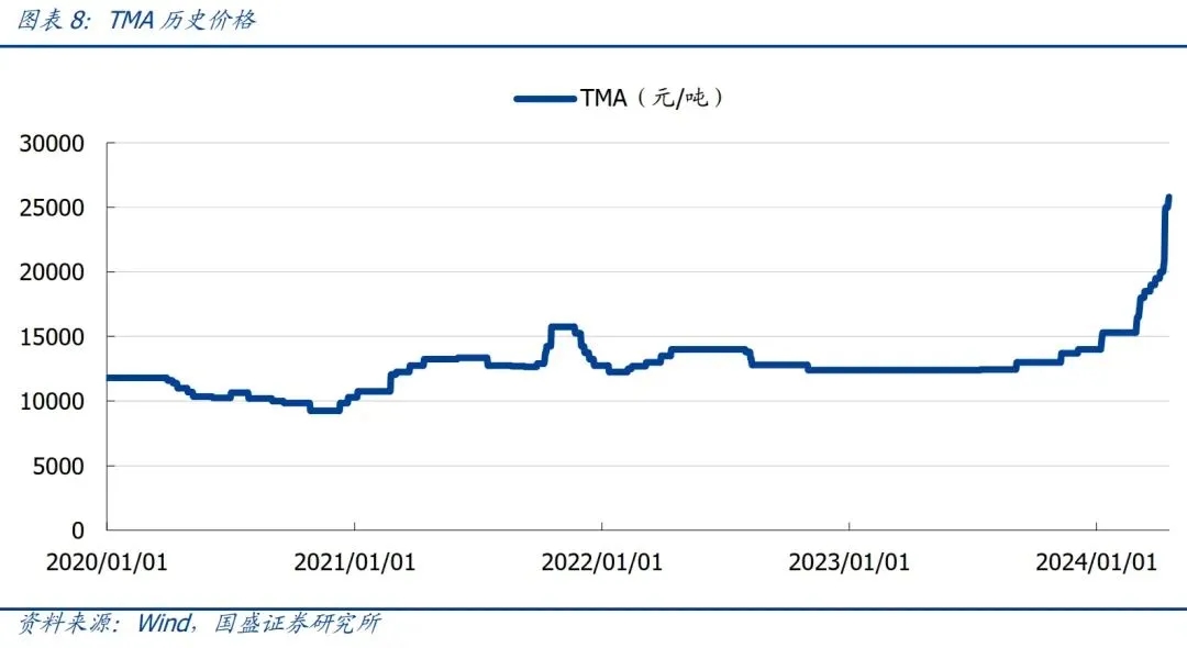 目前,TMA全球總產能約25萬噸,主要有5家生產企業,其中美國英力士7萬噸,意大利波林3萬噸,正丹股份8.5萬噸,百川股份4萬噸,泰達新材3萬噸,屬于壟斷性格局。消息稱“行業第二”的美國英力士裝置宣布結束TMA生產,相關生產設備已拆除,意味著全球供應將出現明顯缺口。另外,國內工廠部分裝置停車或低負荷運行,導致TMA現貨流動整體偏緊。