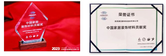 展辰秉承“創新 奮斗 共同成長”的核心價值觀,不斷進行產品創新與工藝升級,助力家居行業高質量發展。為表彰展辰在推動家居行業環保升級過程中的突出表現,經組委會評審,授予展辰“中國家居裝飾材料貢獻獎”,這是對展辰的高度認可和肯定。