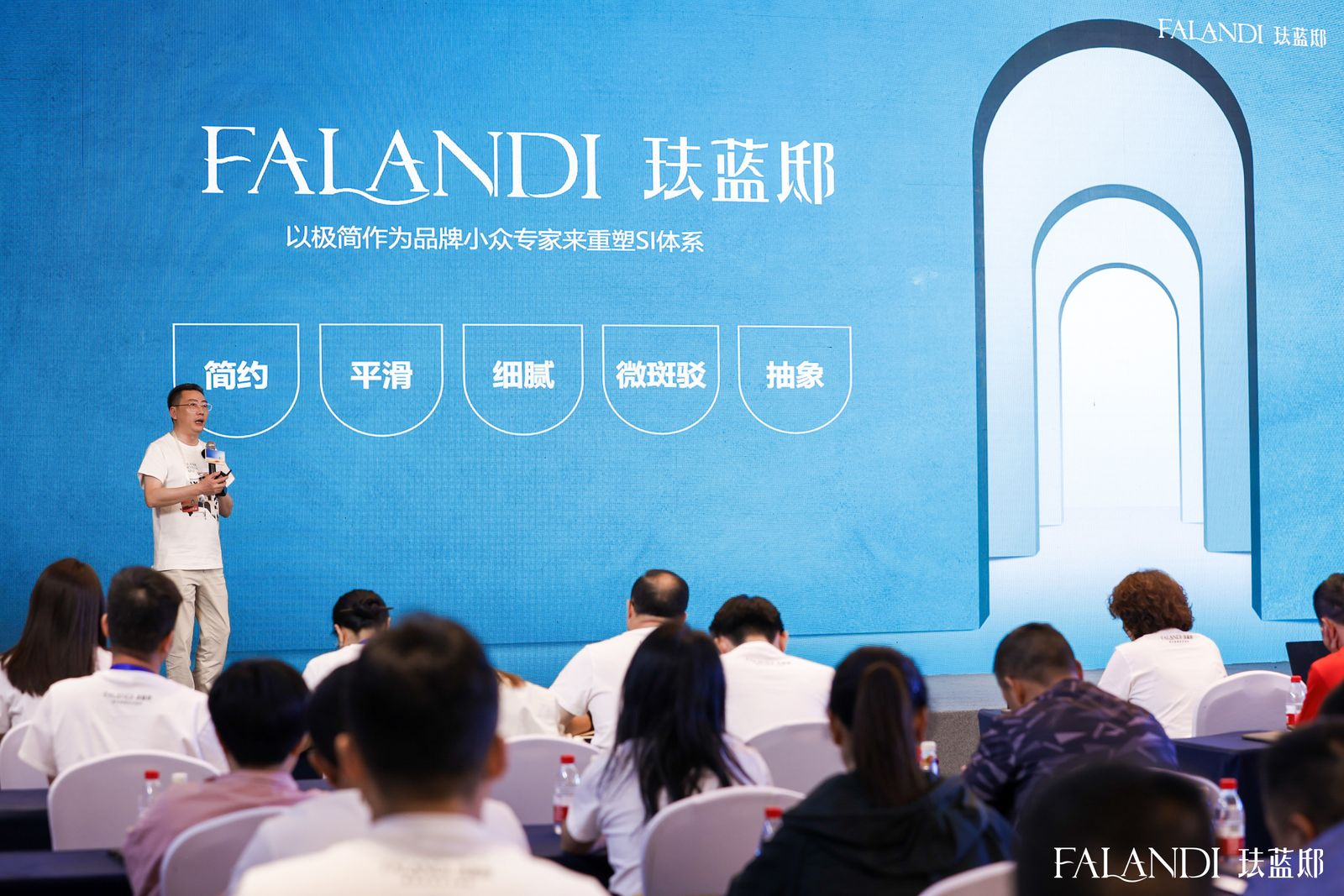 在琺藍邸藝術涂料品牌升級發布會上,全裝修產品事業部副總經理施以森先生為大家詳細介紹了品牌升級的全面內容。本次品牌形象的升級涵蓋了logo設計、超級符號、品牌色彩以及應用延展等多個層面的創新與整體系統的提升,并且正式對外發布了【極簡藝術涂料】的品牌主張。