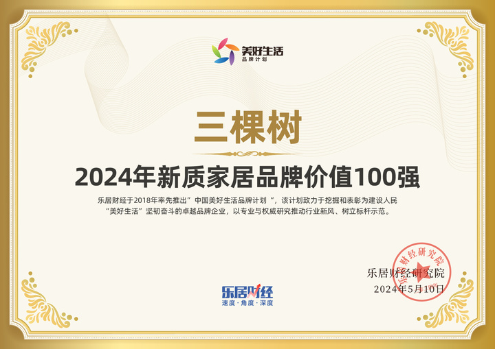 2024年5月10日,是第八個“中國品牌日”。樂居財經特此推出“品牌日”特別企劃,通過主題研討、品牌挖掘、榜單發布,以品牌戰略助推新質生產力企業,發掘“三高”品牌和生活好物,并聯合樂居財經研究院發布“2024年新質品牌價值”系列成果報告。其中,三棵樹榮登“2024年新質家居品牌價值TOP100”榜單。