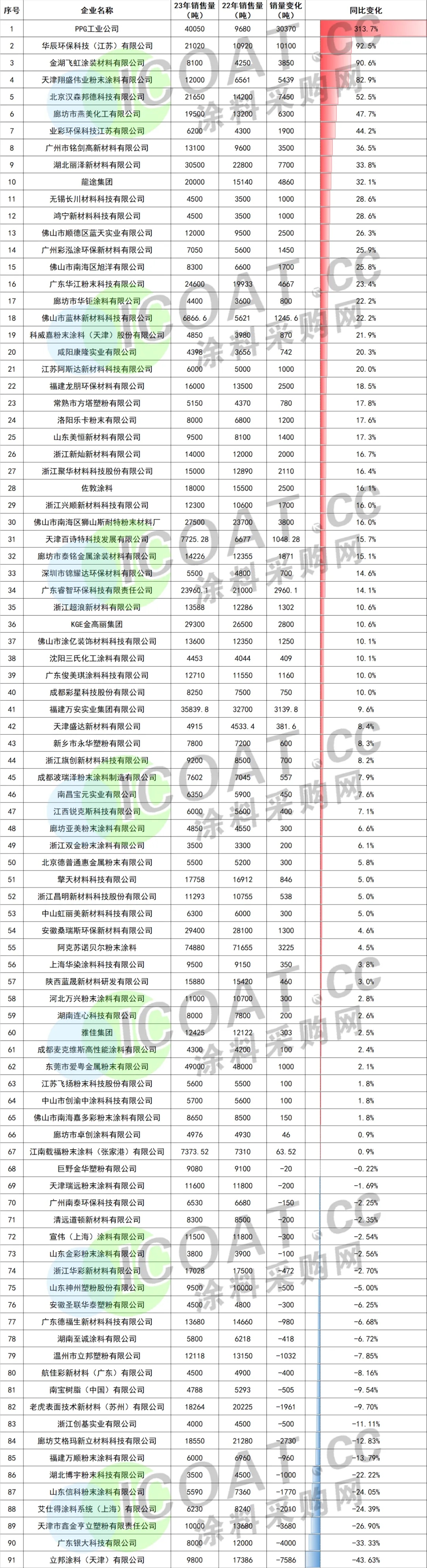 在上升榜中,排名首位的是PPG工業公司,這家在2022年銷量僅為9680噸的企業,2023年直接突破5位數,銷售量同比增長313.7%,原因是數據中包含了四川、浙江、廣東、湖北、安徽、山東等地的華佳工廠。