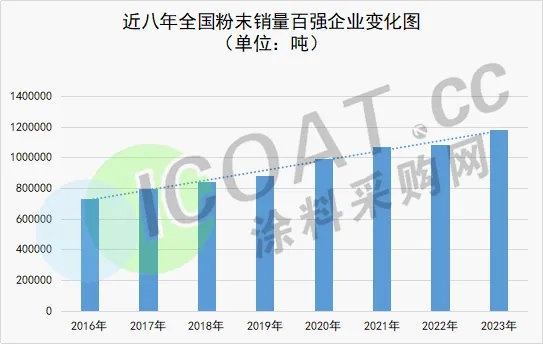 據涂料采購網數據,2023年粉末涂料百強企業銷售量共1181847.3噸,同比2022年增長8.98%。