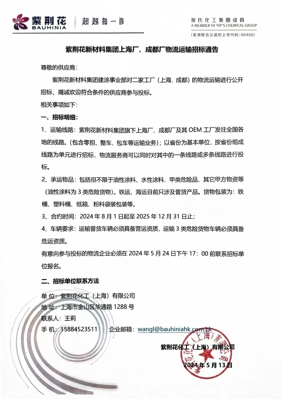 紫荊花發布紫荊花新材料集團上海廠、成都廠物流運輸招標通告。紫荊花新材料集團建涂事業部對2家工廠(上海、成都)的物流運輸進行公開招標,竭誠歡迎符合條件的供應商參與投標。