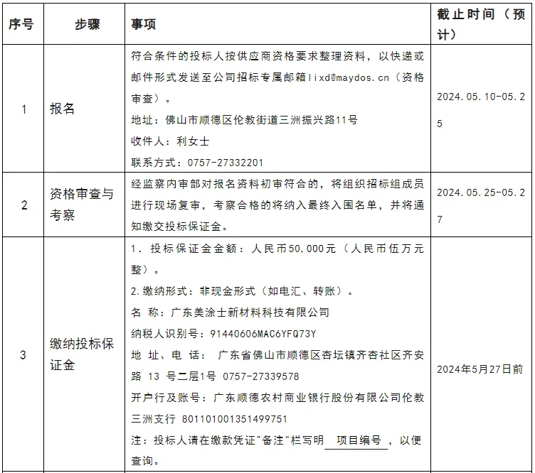 與此同時,美涂士發布全球生態智能總部二期車間設備安裝工程招標公告。廣東美涂士新材料科技有限公司根據市場情況,為了滿足建筑需求,經公司研究,對車間設備安裝工程進行公開招標,歡迎符合條件的合格投標人參加投標,有關事項如下: