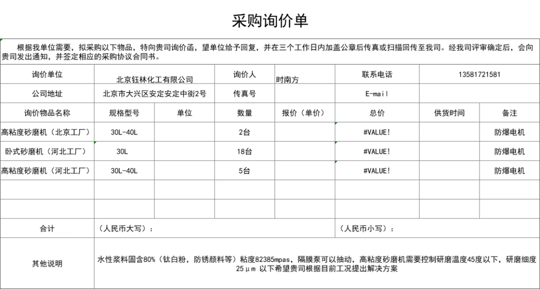 近日,北京鈺林化工有限公司委托涂料采購(gòu)網(wǎng)進(jìn)行30L-40L高粘度砂磨機(jī)以及30L 臥式砂磨機(jī)等設(shè)備的集中采購(gòu),采購(gòu)數(shù)量為25臺(tái)。