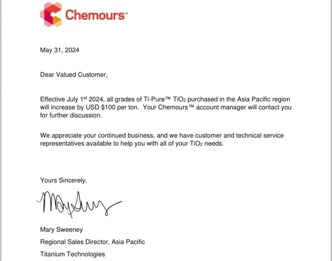 科慕:7月1日起,在亞太地區購買所有等級的Ti-Pure™鈦白粉每噸將增加100美元。
