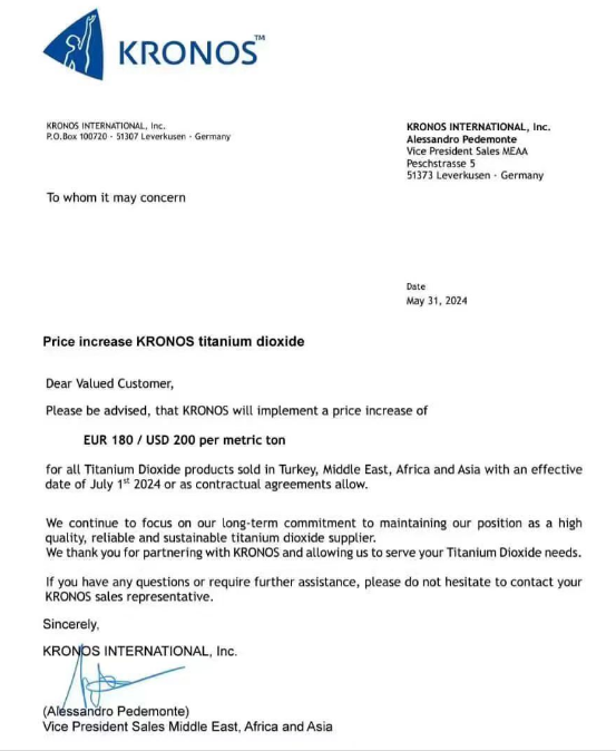康諾斯:7月1日起,鈦白粉每噸上漲180歐元/200美元,適用于在土耳其、中東、非洲和亞洲銷售的所有鈦白粉產品。