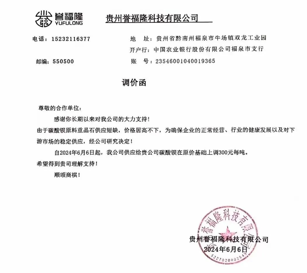 貴州譽福隆科技:6月6日起,碳酸鋇在原價基礎上調300元/噸。