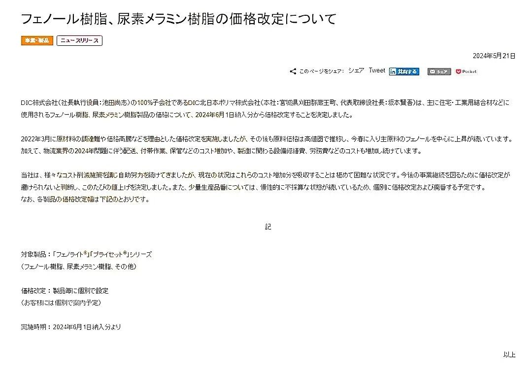 北日本聚合物株式:6月1日起,對酚醛樹脂、尿素三聚氰胺樹脂產品進行漲價。