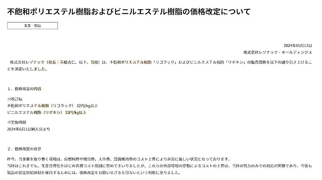 雷佐納克株式會社:自6月1日起,提高不飽和聚酯樹脂“Polygrac”及乙烯基酯樹脂“Polyxid”的售價,稱在此前價格基礎上提漲32日元/kg以上。