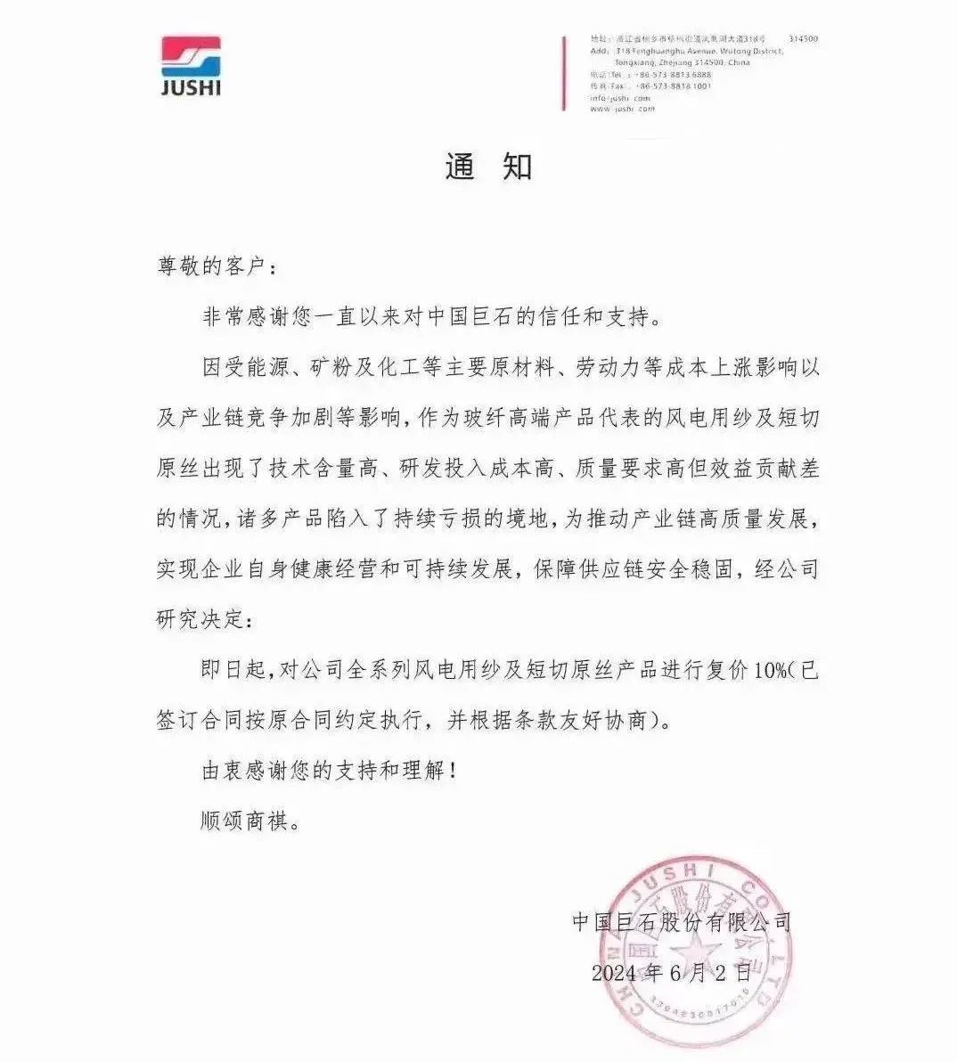 中國巨石:即日起,對全系列風電用紗及短切原絲產品進行復價10%。