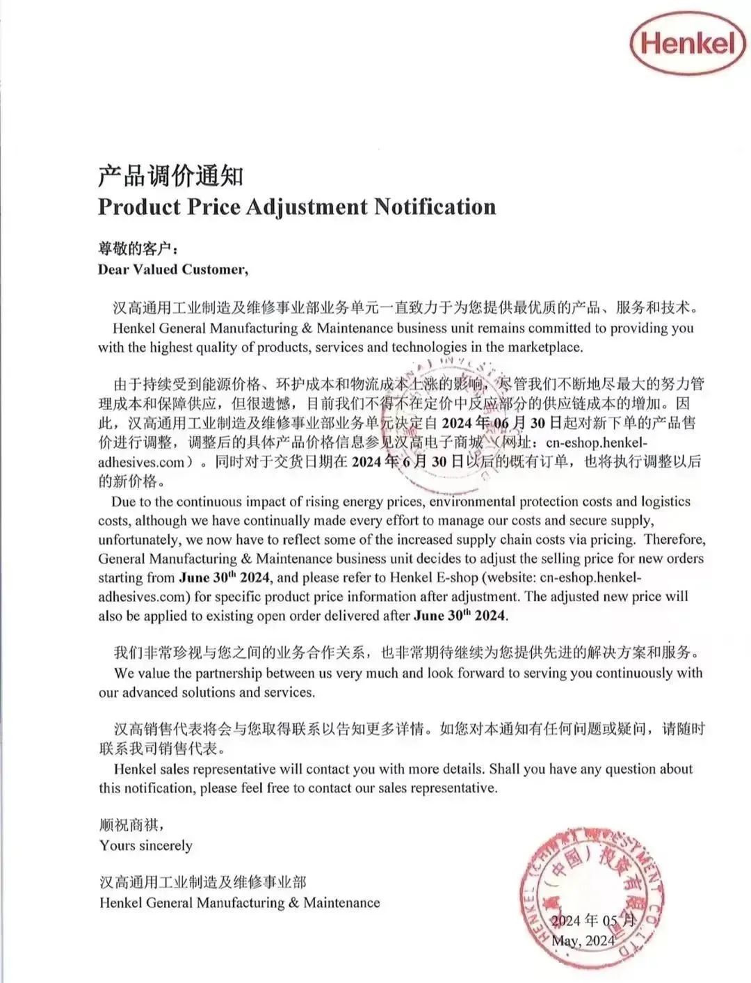 漢高:通用工業制造及維修事業部業務單位將從6月30日起對產品售價上調。