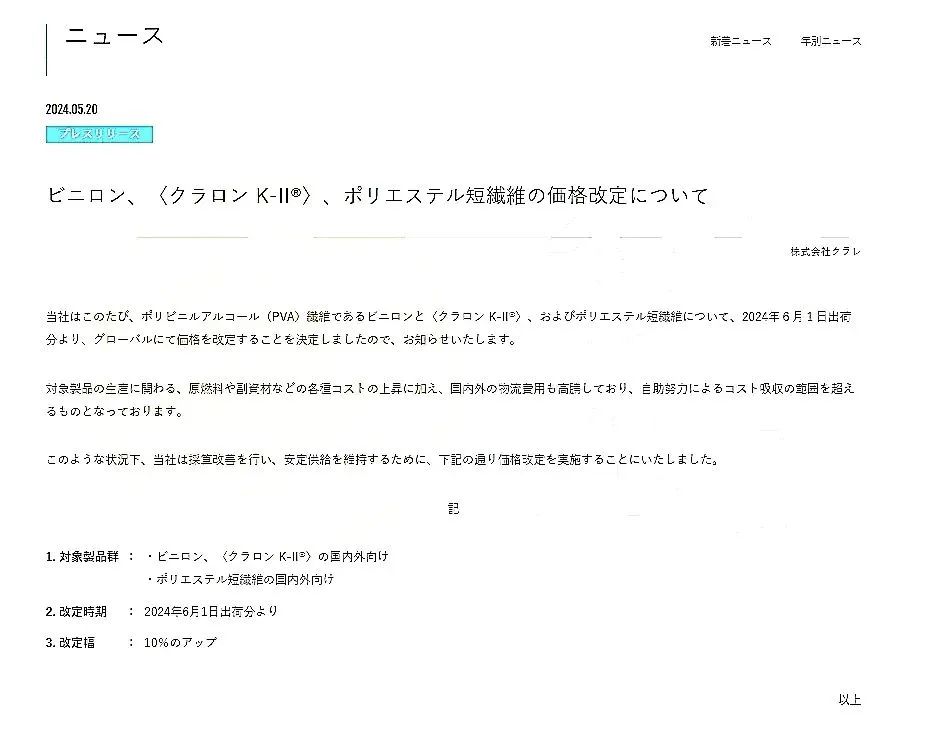 可樂麗:聚乙烯醇(PVA)纖維維尼綸、〈氯綸K-II®〉及聚酯短纖維6月進行全球范圍價格提漲10%。