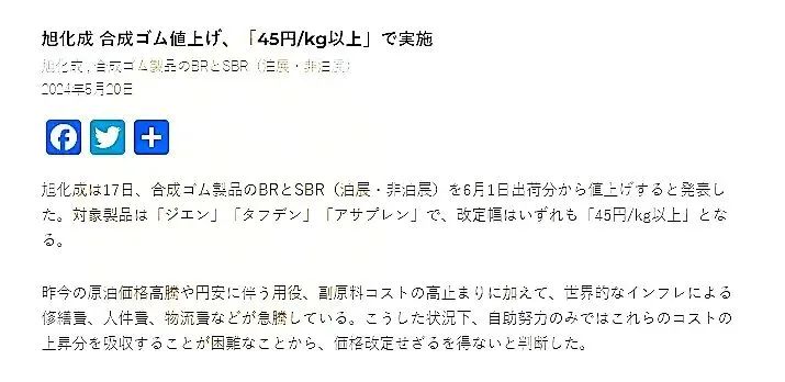 旭化成:對旗下合成橡膠制品的BR和SBR提價45日元/公斤以上。