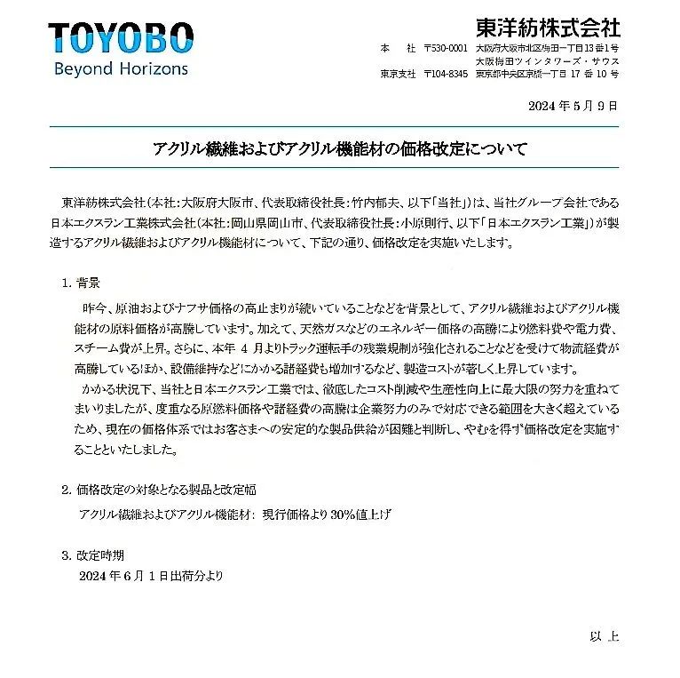 東洋紡株式會社:對生產的丙烯酸纖維和丙烯酸功能材料在當前的價格基礎上提漲30%。