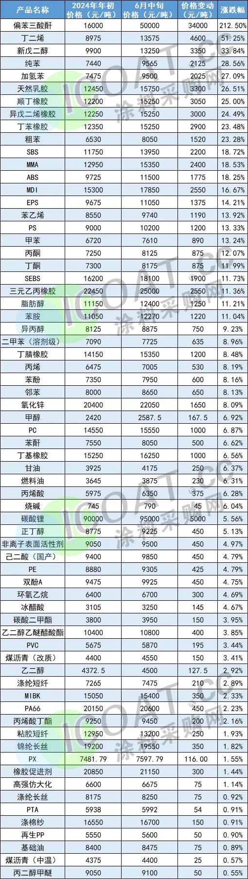 眾多企業已經安排好了6月乃至7月的化工品漲價,讓大眾議論紛紛,是不是如今的市場行情已經好轉,才拉動了化工品的漲價?為了解具體情況,涂料采購網統計了2024年上半年化工品的漲價情況,發現偏苯三酸酐(TMA)、丁二烯、純苯、加氫苯、粗苯、MDI等化工品漲勢驚人,最高上漲超過200%。
