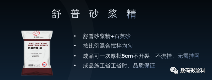 舒普砂·精除了繼承舒普砂漿一次厚批5㎝不開裂、不掛留、無需掛網的特性外,只需客戶根據實際需求操作,按照比例混合攪拌均勻即可,比如說20㎏舒普砂漿·精+40㎏砂得到60㎏的成品,和舒普砂漿性能一致,但是可以節約40㎏的運輸和倉儲成本。