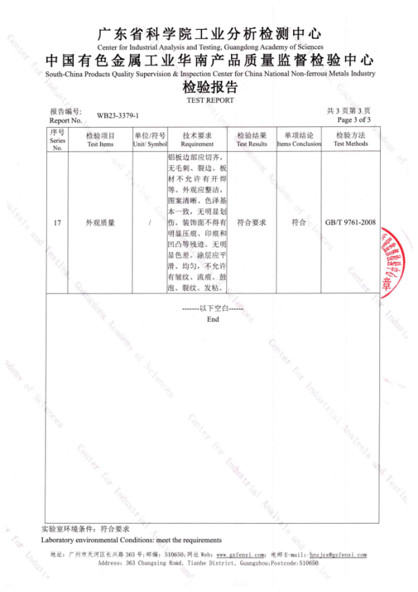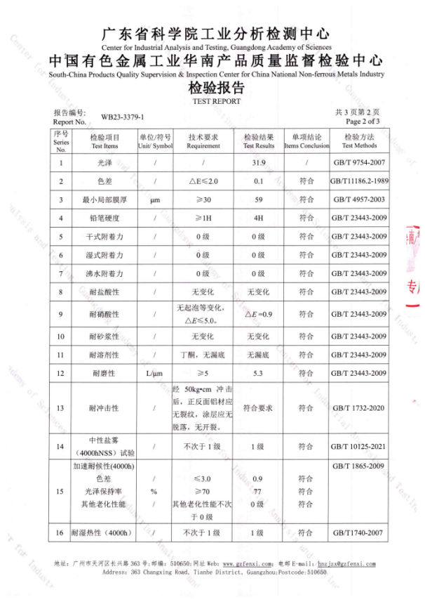 據廣東省科學院工業分析檢測中心提供的檢驗報告,立幸邦PVDF(70%)固體氟碳涂料加速老化4000小時后,仍能保持超高的保光度。此外,色差、鉛筆硬度、干式附著力、濕式附著力、耐鹽酸、耐硝酸、耐砂漿、耐溶劑、耐磨性等均符合要求。可見在環保日益嚴苛的大環境下,立幸邦PVDF(70%)固體氟碳涂料已經成為液體氟碳漆的升級產品。