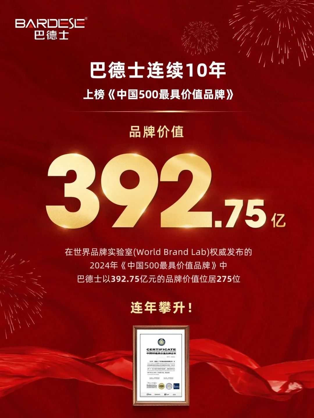 這既是對(duì)巴德士品牌實(shí)力的又一次權(quán)威力證,同時(shí)也是巴德士品牌多年來堅(jiān)持創(chuàng)新、堅(jiān)持品質(zhì)發(fā)展的一次集中體現(xiàn)。據(jù)涂料采購網(wǎng)了解,自2015年以來,這已經(jīng)是巴德士連續(xù)10年入圍“中國500最具價(jià)值品牌”。且品牌價(jià)值和排名每年均有上升。品牌價(jià)值從2015年的89.87億元增長至2024年的392.75億元,過去十年時(shí)間里增長約337%,巴德士品牌社會(huì)影響力和公信度持續(xù)擴(kuò)大。