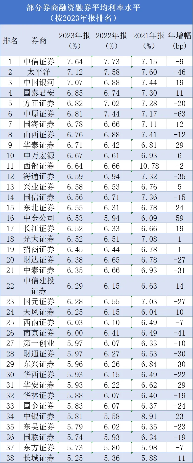 券商打響新一輪傭金價(jià)格戰(zhàn),目前市面上多家券商融資年利率可做到5%以下,還有券商給出“500萬(wàn)元資金即可給到4%”的超優(yōu)惠費(fèi)率。目前的實(shí)際操作中,最大折扣已低于公示利率的五折。對(duì)2021年至2023年間有可比數(shù)據(jù)的38家上市券商融資融券利率進(jìn)行統(tǒng)計(jì)發(fā)現(xiàn),兩融利率已處于長(zhǎng)期下降通道。