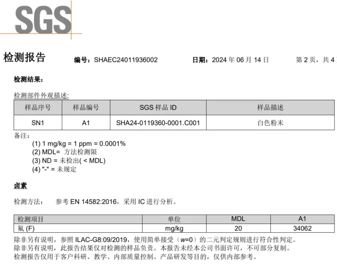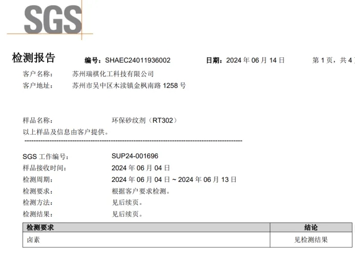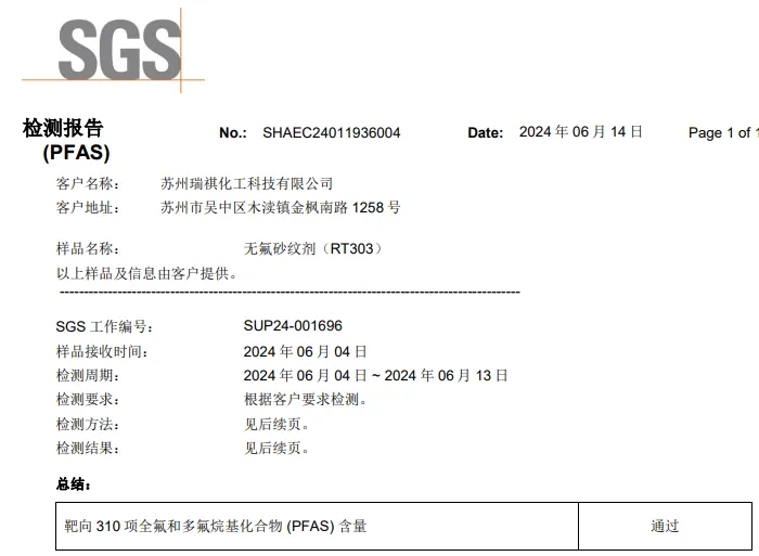 憑借在粉末涂料行業(yè)多年的深厚積累,蘇州瑞祺化工科技有限公司(或稱瑞祺化工)敏銳地捕捉到了這一市場變化,始終堅(jiān)持綠色環(huán)保的發(fā)展理念,專注于環(huán)保型粉末涂料配方、助劑及新型原材料的研發(fā)和生產(chǎn)。其中砂紋劑產(chǎn)品可謂是拳頭產(chǎn)品,不僅在性能上超越了傳統(tǒng)砂紋劑,更在環(huán)保方面樹立了新的標(biāo)桿。根據(jù)最近SGS檢測報告,環(huán)保砂紋劑產(chǎn)品的含氟情況符合歐盟標(biāo)準(zhǔn),PFAS未檢出,品質(zhì)可靠,更值得信賴。