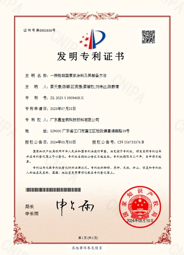 中國發明專利: 一種批刮型厚漿涂料及其制備方法 (專利號: ZL 2023 1 0909408.X)