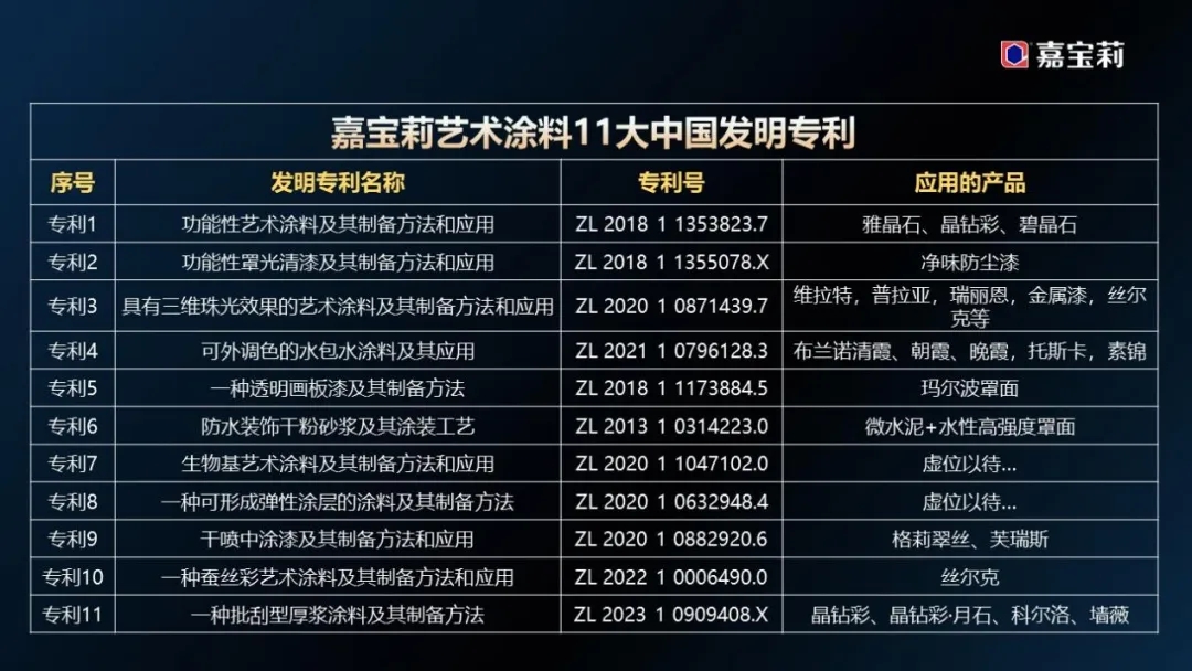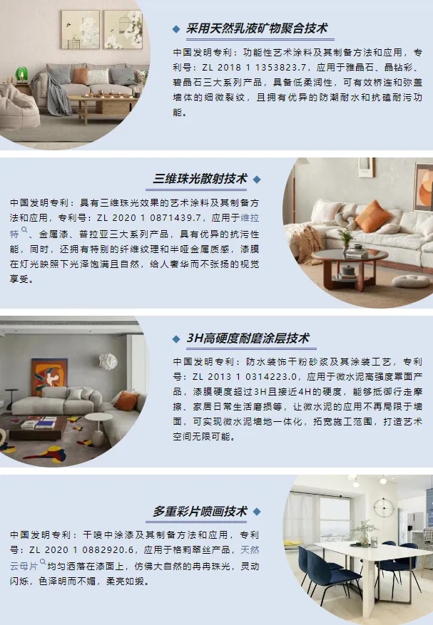 這些中國發明專利技術在產品研發上的應用,不僅提升了嘉寶莉藝術涂料的品質和性能,也為用戶帶來了更優的家居墻面涂裝體驗及更美好的空間裝飾效果感受。