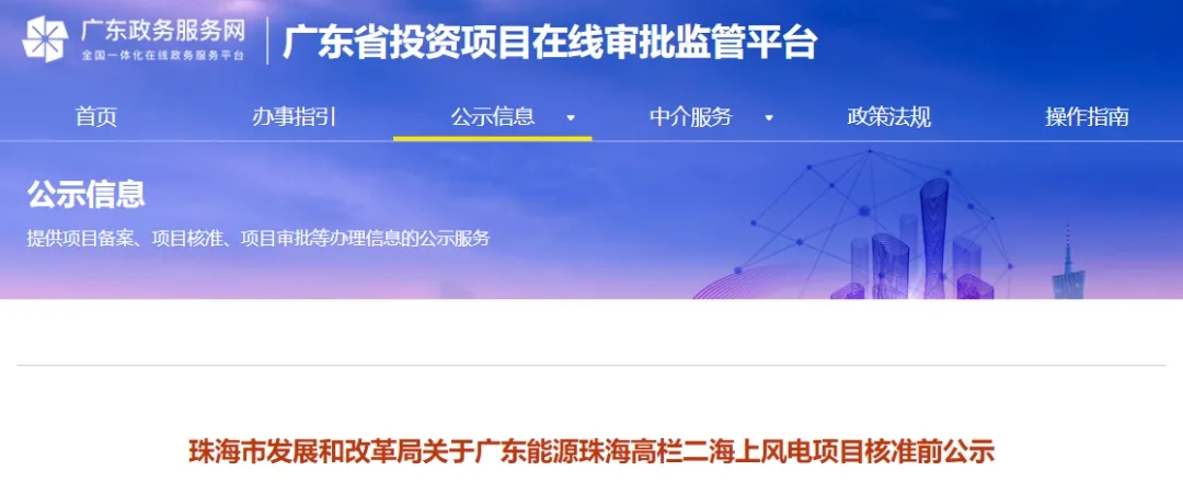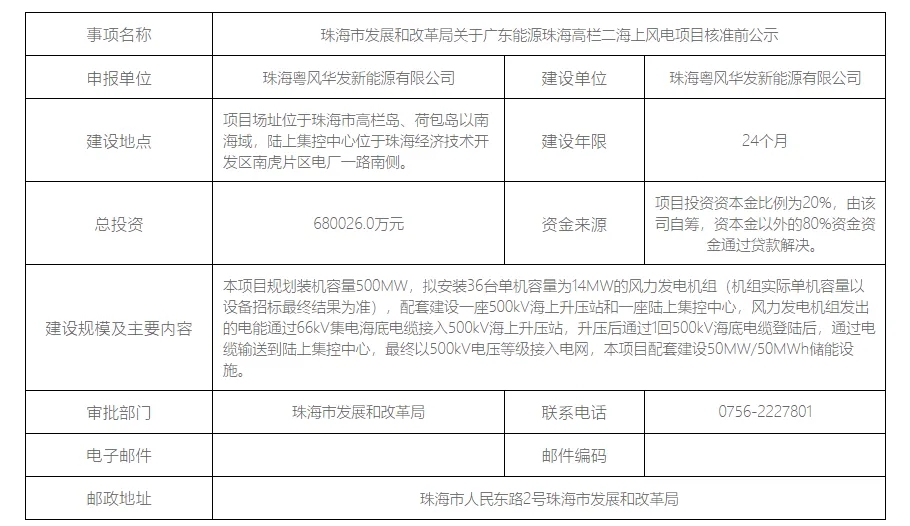 近日,珠海市發(fā)展和改革局發(fā)布關(guān)于廣東能源珠海高欄二海上風電項目核準前公示。