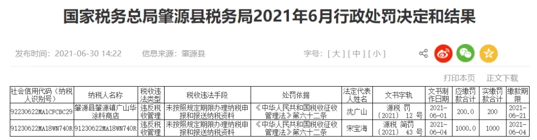 肇源縣肇源鎮廣山華涂料商店未按照規定期限辦理納稅申報和報送納稅資料,依法應繳罰款合計200元。