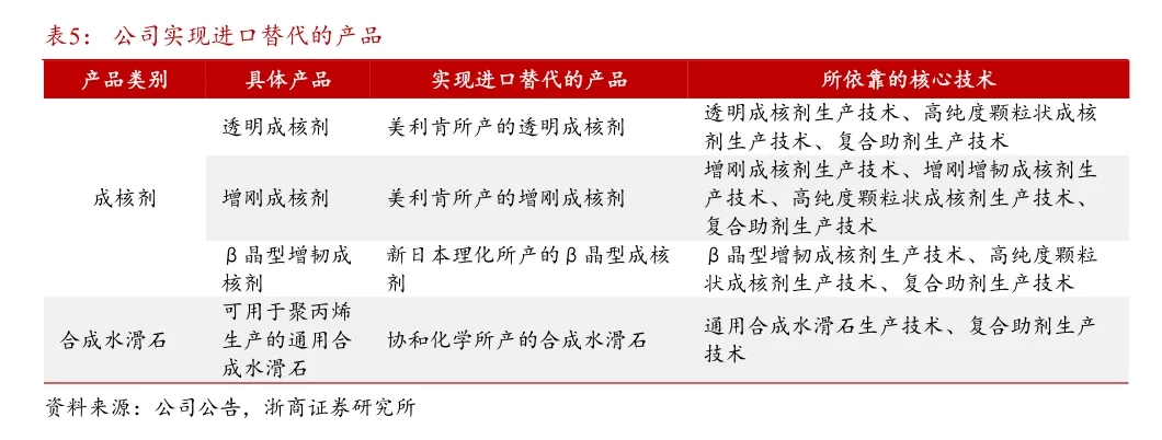 呈和科技通過自主研發與不斷創新,目前對透明成核劑、增剛成核劑以及β晶型增韌成核劑均實現了部分進口替代,通用合成水滑石也可作為協和化學的替代產品。