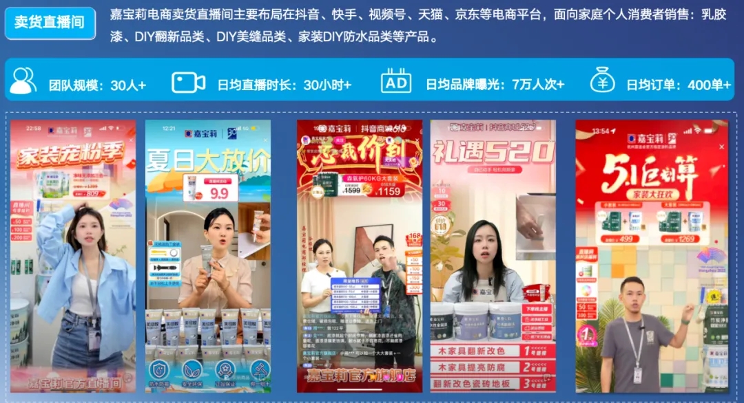直播帶貨作為新興模式,響應(yīng)了高質(zhì)量發(fā)展的要求。它通過提供更加個(gè)性化、互動(dòng)化的服務(wù),滿足了消費(fèi)者對(duì)于購(gòu)物體驗(yàn)質(zhì)量的更高要求。嘉寶莉從2022年開始便積極布局電商直播,直播范圍涵蓋抖音、快手、天貓、京東、視頻號(hào)等多個(gè)平臺(tái)。以線上銷售與線下引流為目標(biāo),有效整合優(yōu)質(zhì)資源,實(shí)現(xiàn)新質(zhì)的營(yíng)銷;同時(shí),創(chuàng)新數(shù)智賦能,通過數(shù)據(jù)反饋,優(yōu)化營(yíng)銷策略,從而有效提升品牌影響力。