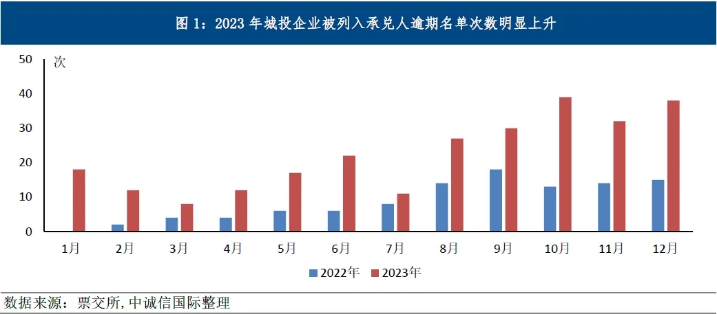 數據顯示,自2021年8月至2024年5月,累計有206家發債城投出現承兌人逾期,逾期記錄達到749條。在剛剛過去的2023年,城投商票被列入承兌人逾期名單次數呈現上升態勢,全年列入逾期名單次數為266次,全年共有79家城投企業出現在商票承兌人逾期名單上,截至2023年底,仍有28家企業未完成兌付,涉及金額超32億元。