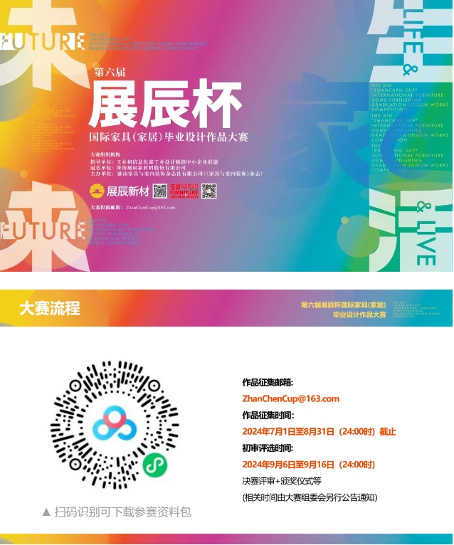 本屆“展辰杯”國際家具(家居)畢業設計作品大賽以“未來生活家”為主題,旨在鼓勵參賽者在設計理念、方式和思維上進行創新和升級,設計出具有創新性、綠色性、美觀性和想象性的家具(家居)產品、家具(家居)空間、商業空間、辦公空間等,以滿足未來生活方式和需求的變化。