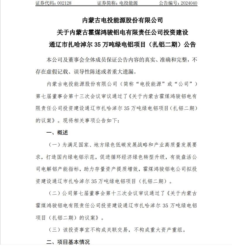 公司第七屆董事會(huì)第十三次會(huì)議審議通過了《關(guān)于內(nèi)蒙古霍煤鴻駿鋁電有限責(zé)任公司投資建設(shè)通遼市扎哈淖爾35萬噸綠電鋁項(xiàng)目(扎鋁二期)的議案》。