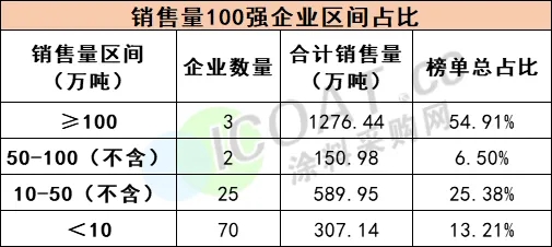 根據涂料采購網數據中心統計,2023年涂料銷售100強企業總銷量為23245175.12噸,同比2022年增長1647226.87噸,增幅為7.63%。其中銷量在100萬噸以上的企業有3家,合計銷量為1276.44萬噸,占總銷量的54.91%,與2022年的情況基本持平;50萬噸-100萬噸(不含)、10萬噸-50萬噸(不含)的企業分別為2家和25家,占比為6.50%和25.38%。70家企業銷量在10萬噸(不含)以下區間,合計銷量為307.14萬噸,在總銷量占比僅為13.21%。